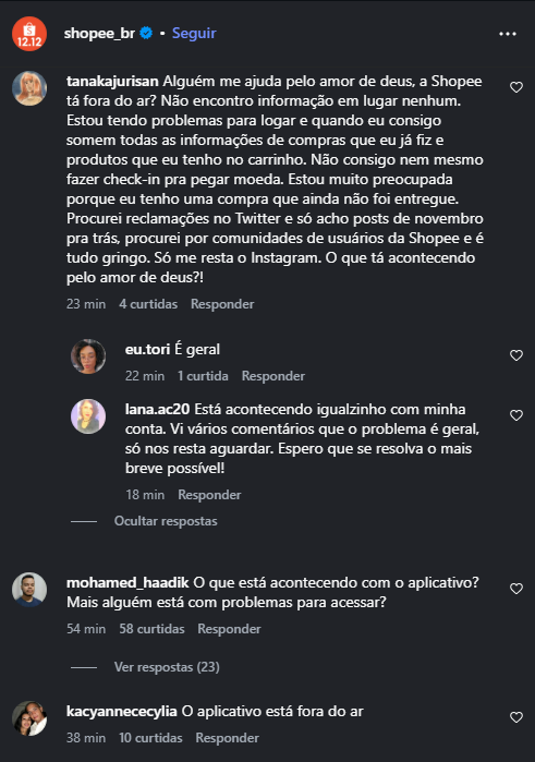 Enquanto a empresa mantém silêncio, os usuários utilizam o espaço de comentários das postagens oficiais da Shopee no Instagram para relatar os problemas e cobrar soluções.