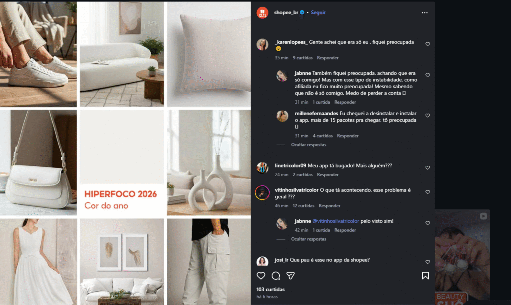Legenda: Usuários relatam instabilidade massiva nos comentários do Instagram oficial da Shopee.